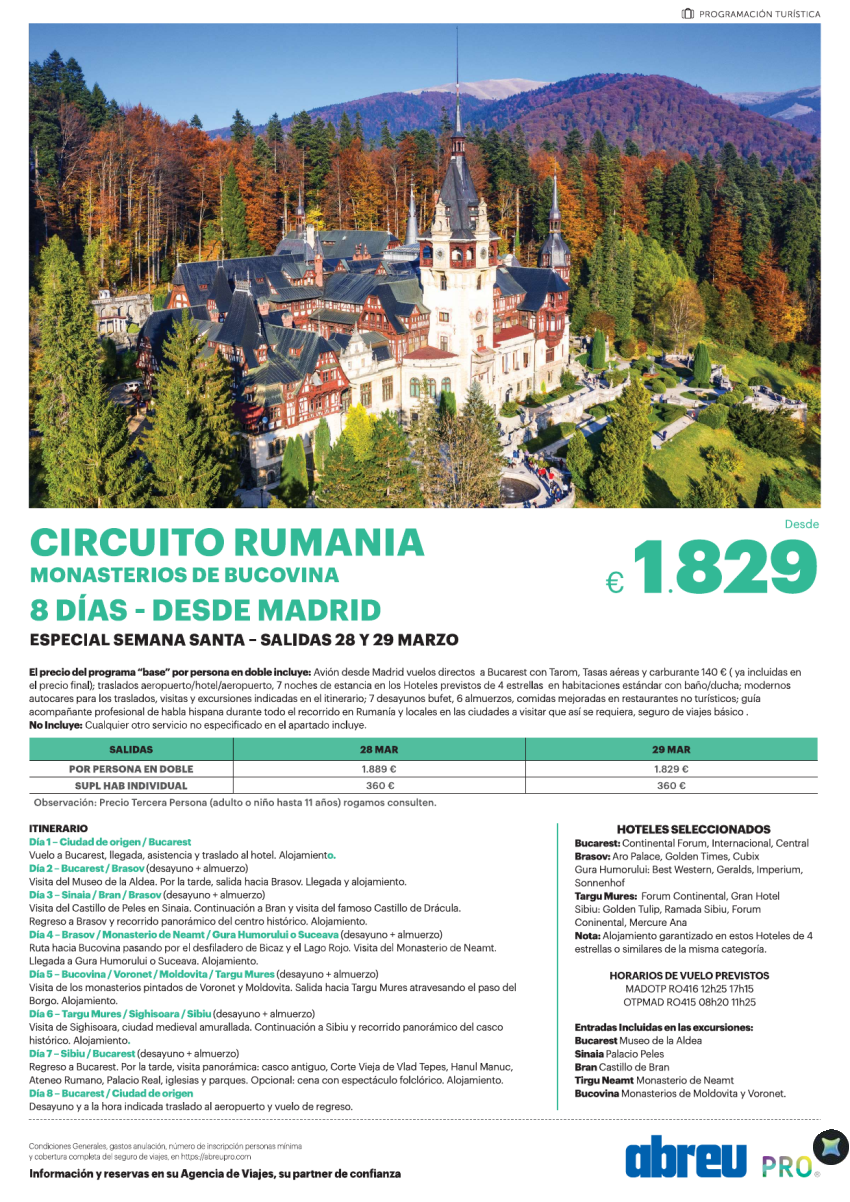 Novedad Semana Santa Circuito Rumania 8 días desde Madrid salida 28 y 29 Marzo